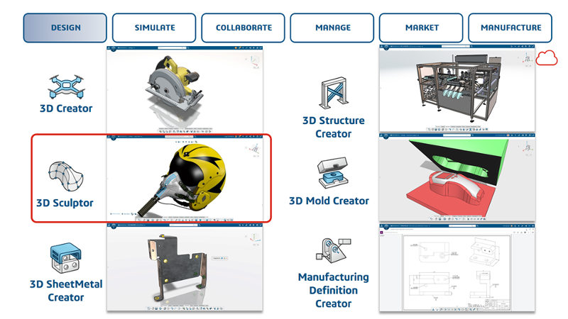 • 3D Mold, SheetMetal, Structure e Manufacturing Creators – soluções específicas para moldes, chapas metálicas, estruturas e definição técnica para produção